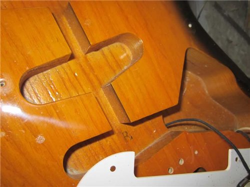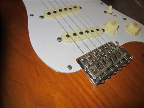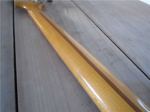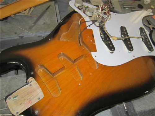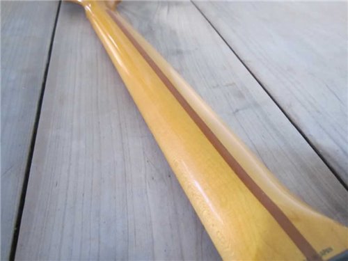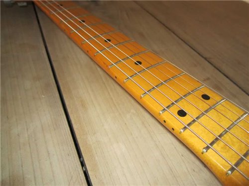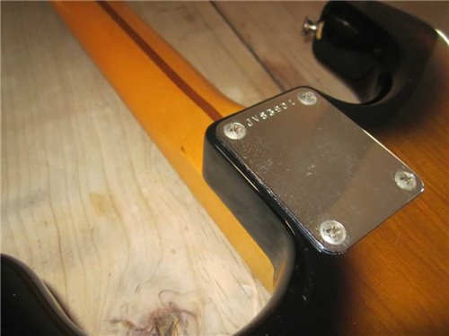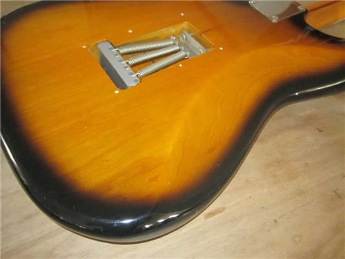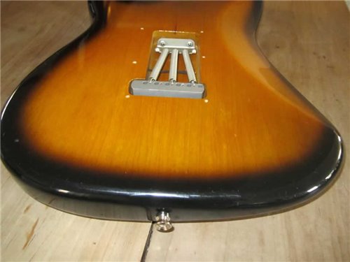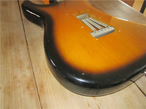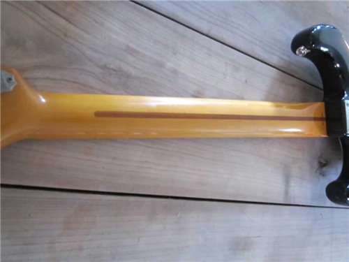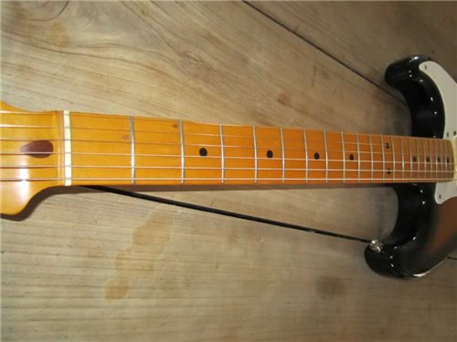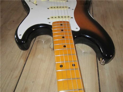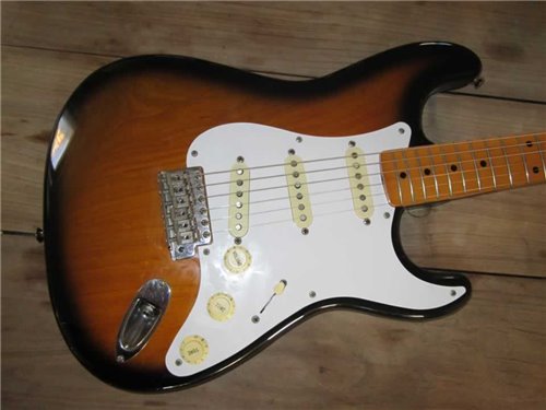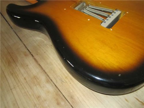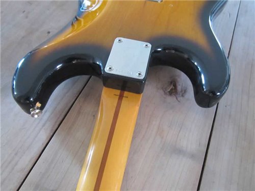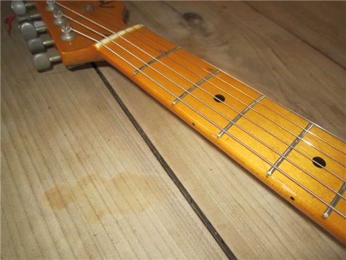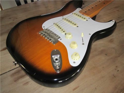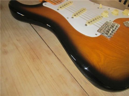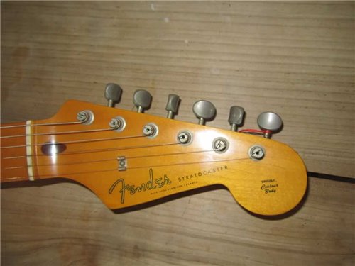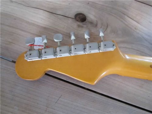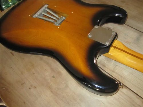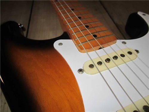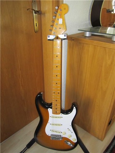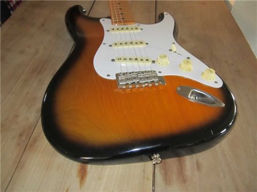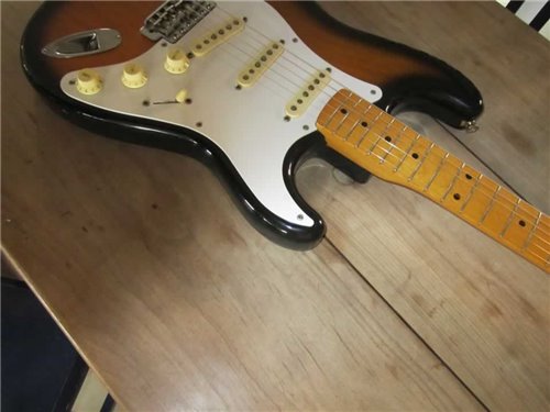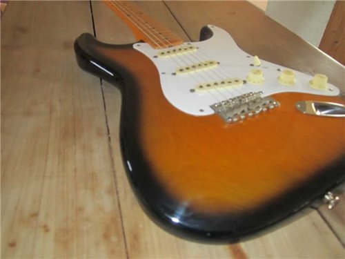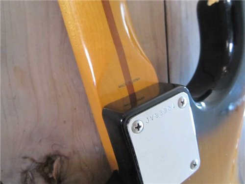 Hier haben wir eine späte Fender JV ST57-65, die ich mit einem Custom Order Body in bester Manier versehen habe. Dieser Body muss man nur anschauen und man sieht sofort, so etwas sieht man selten. Eine so schöne Erle an einem Stück, das kann nur Custom Order sein und natürlich beweisen die Stempel, dass es eben ein Custom Order Made Body ist. Der Rest der Gitarre ist 100% Fender ST57-65 JV. Das heisst, der Hals ist ein sehr gut erhaltener ST57-65er Hals und die Fullerton Black Bobbin Pickup sind ebenfalls korrekt. Auch die Bridge und die Elektronik sind originale JV Parts. Für den Player ist es technisch gesehen eine einwandfreie und wirklich sehr schöne Stratocaster, die wie eine JV klingt und natürlich hat dieser Body etwas besonderes was die Dame einzigartig macht. Sie klingt wie sie klingen muss, einfach fendrig.