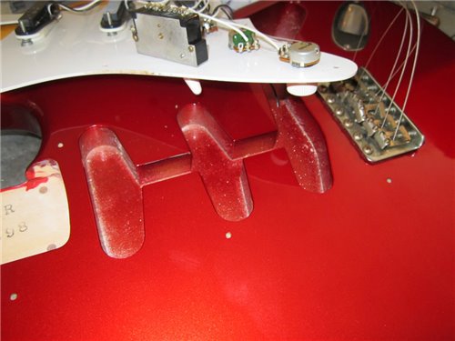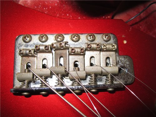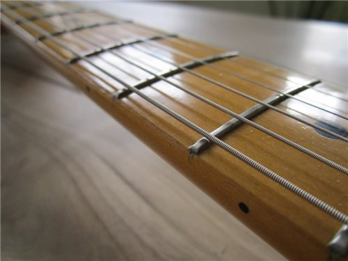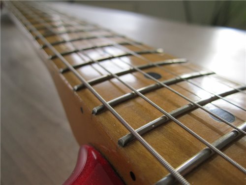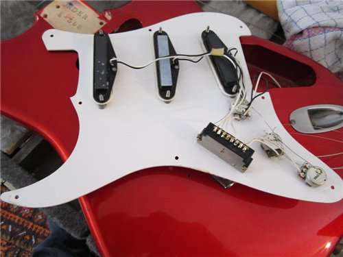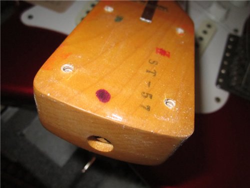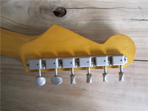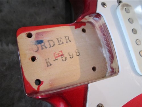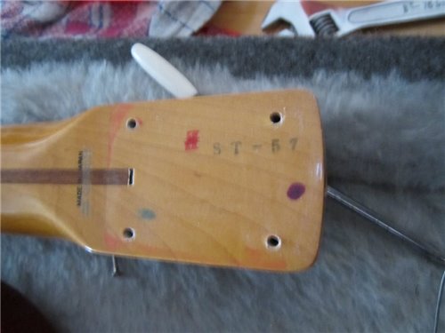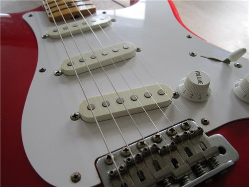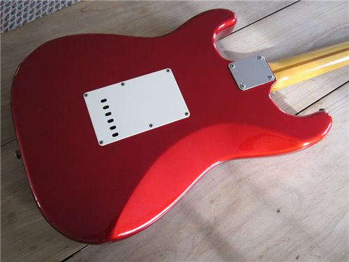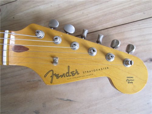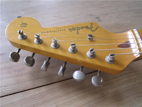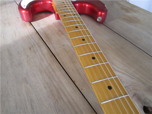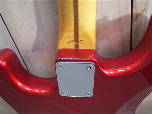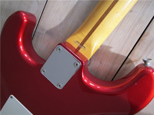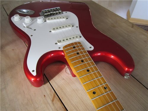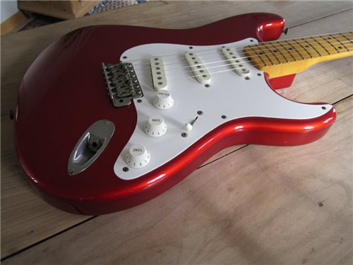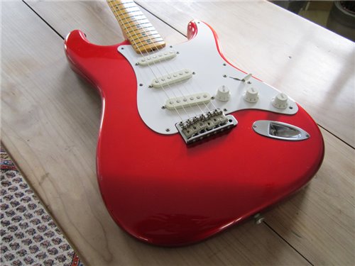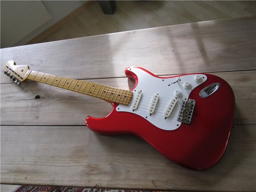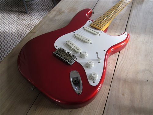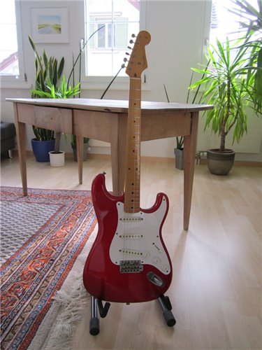 Eine Fender JapanStratocaster 57 und zwar eine nicht serienmässige Order Made. Das wunderschöne Rot ist kein CAR, Candy Apple Red, denn es verändert sich im Farbton, je nach Lichteinfall, es ist die schönste rote Lackierung, die ich bis jetzt gesehen habe. Die Farbbezeichnung ist mir nicht bekannt. Diese Gitarre hat Made in Japan Alnico Pickups und eine Polyester-Lackierung. Sie hat den echten drahtigen Fender Stratocaster Sound, den man liebt. Die Gitarre ist in der gewohnten Fujigen Qualität und überzeugt schnell mal. Eine echte Fender Gitarre zum guten Preis in gutem Zustand. Warum der Hals nicht auch als Order Made gekennzeichnet ist, kann ich mir nur erklären mit der Möglichkeit, dass der Besteller einen Standard-Hals von einer 57er Stratocaster auf einem Custom Order Body haben wollte. Die Gitarre ist sehr leicht.