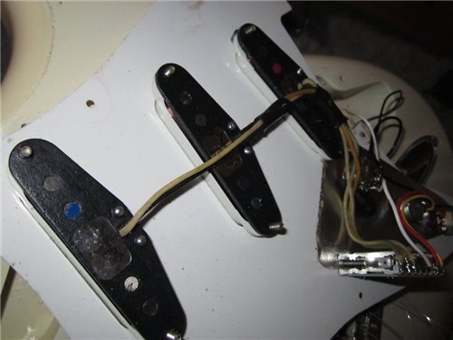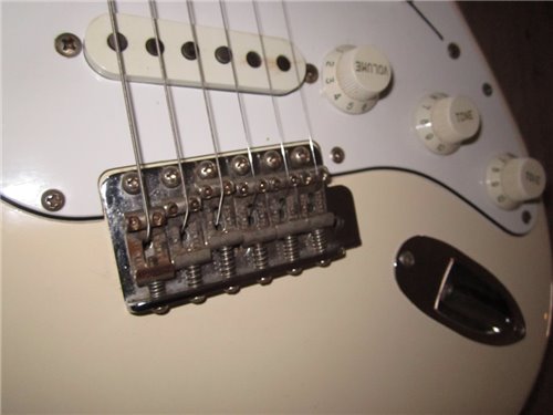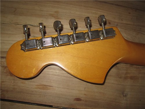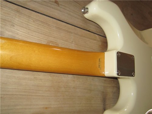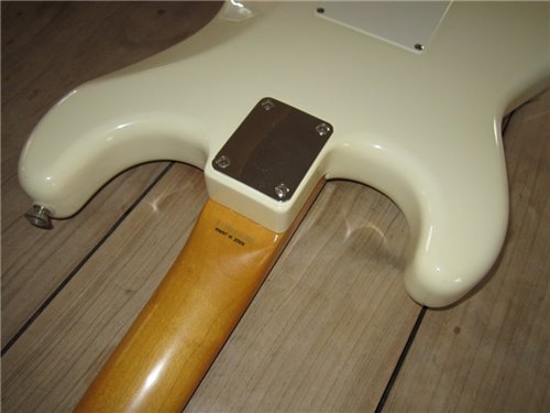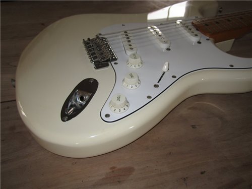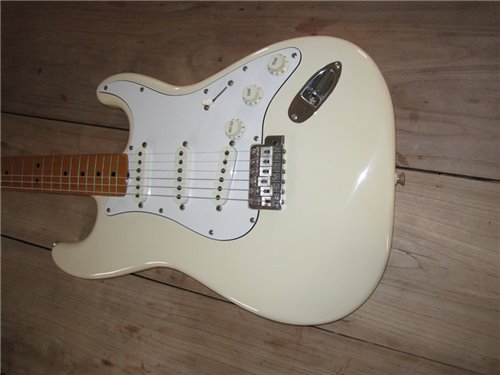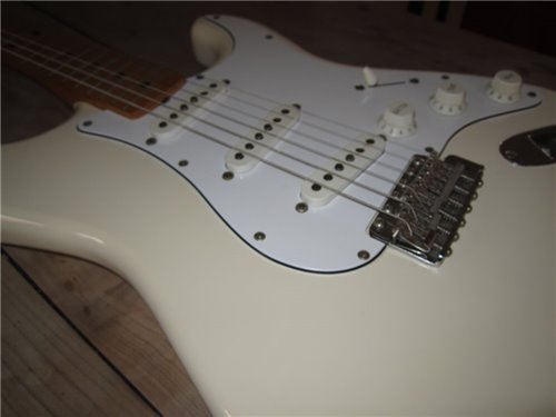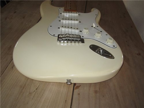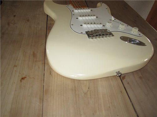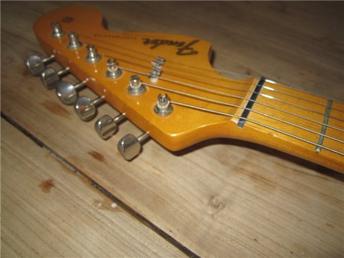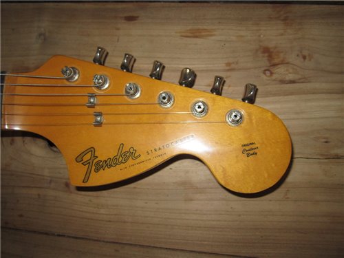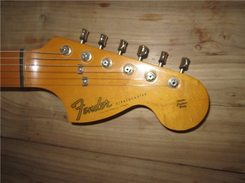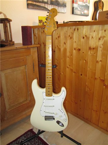 Eine 67er Stratocaster, ST67-95, in ausgezeichnet gutem und technisch einwandfreiem Zustand. Diese Vintage Gitarre ist der perfekte 67er Nachbau, der CBS Gitarre, die noch mit dem alten pre CBS Logo ausgeliefert wurde. Bereits im selben Jahr wurden diese Gitarren auch mit dem neuen CBS Fender Logo ausgeliefert, solch eine Fender (ST68) spielte Hendrix am Woodstock Festival, diese hatte eben das grosse CBS Logo und auch die vier Punkte Verschraubung so, wie diese Gitarre auch. Sehr gute Qualität, enormes Soundverhalten mit mächtigem Ton. Eine echte Vintage Stratocaster, mit den besten Eigenschaften und natürlich ist es eine Gitarre, bei der der Wert sicher steigen wird, denn sie ist selten anzutreffen und meistens ist der Preis jetzt schon weit über 1000 Dollar. Die Gitarre hat die USA Vintage PU' s verbaut und ich habe ihr einen neuen Sattel eingepasst. Sie ist ausgezeichnet bespielbar und es ist etwas, was nicht jeder hat.