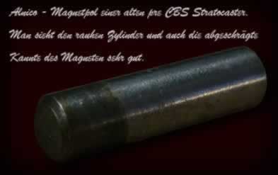Magnetische Polarität (MP): Dies ist die magnetische Polarität auf der Oberseite des Tonabnehmers. Alle Magnete haben zwei Pole: Norden und Süden. Die Umkehrung der Pole bewirkt eine umgekehrte Phase des Pickup. Vintage Fender Pickup-Magnete vom Typ Alnico bestehen aus Aluminium, Nickel und Cobalt. Sie sind "Sand gegossen", und haben deshalb ein grobes, raues Aussehen mit ganz feinem Lochfrass, die von der Sandform stammen. Die Spitzen der Magnete werden flach geschliffen auf der PU-Oberseite. Normalerweise waren die Magnete am anderen Ende etwas abgeschrägt, was die Duchführung der Magneten durch die Vulkanfiber-Bobine erleichtert hat. Dies ist sehr auffällig bei der Stratocaster und ist nicht existent auf pre-1955 Teles. Pre-1965 Magnete sind inkonsistent im Durchmesser, der zwischen ca. 0,185 bis 0,197 Zoll liegen kann. Zum grössten Teil sind die Magnete sehr eng in der Bobine verankert. Am Anfang, ca. 1965, hatte man den Eindruck, dass der Durchmesser um ein paar wenige Tausendstel Zoll geschmälert wurde bei den Magneten. Daher waren die Magnete nicht so stark verankert in der Bobine und sie können hin- und her geschoben werden. Ab Mitte 1960 hatten die Magnete feinere Kanten, und die Abschrägung der Pickups wurde schliesslich vollständig in den frühen 1970er Jahren gestoppt.