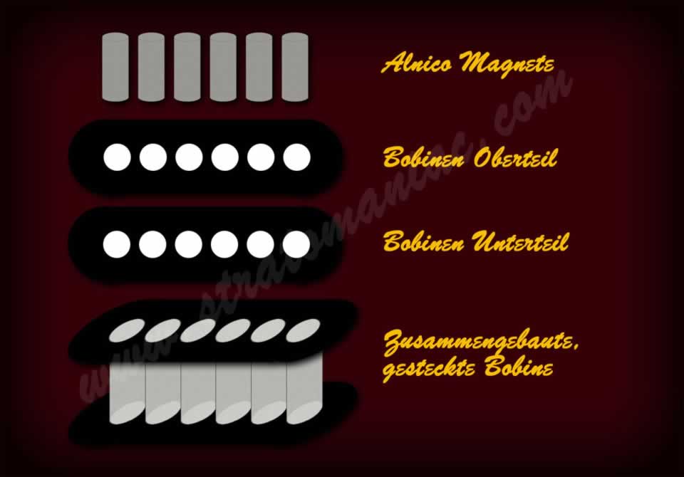 Single Coil Pickup: Alle Fender Pickups sind Single Coil Einheiten. Im Vergleich dazu stehen Pickups von Gibson, die mit der Doppel-Spule (Humbucker) im Jahr 1957 auf den Markt kamen. Single Coil Pickups haben eine Spule von gewickeltem Draht um die Magnete. Single Coil Pickups sind anfälliger auf Einfluss von aussen, zum Beispiel durch den 50 oder 60 Hz-Brumm oder durch Leuchtstoffröhren.